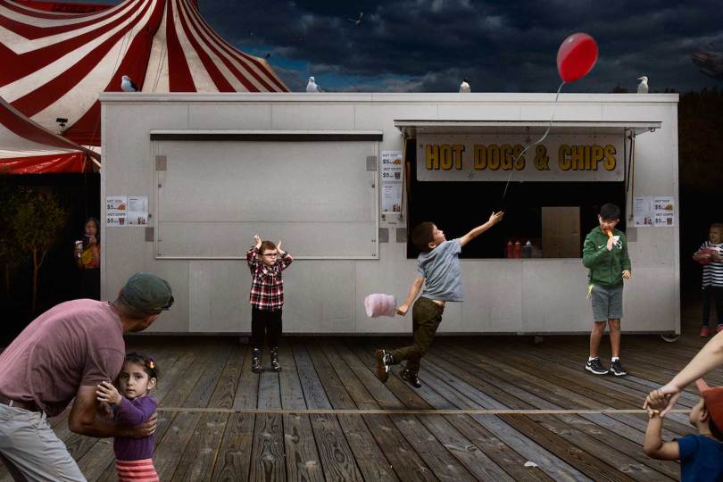 The Sideshow is the much anticipated new series from The International Collaboration Project duo Deb Young (New Zealand) and Francisco Diaz (USA), designed to usher the viewer to a fictitious seaside carnival, where the notion of the sideshow acts as a metaphor for the human condition. We view ourselves bathed in the amusement park experience where consumption, excitation, fun and desire are the driving motivations, all as storm clouds surround and threaten the ongoing festivities. Focused on their involvement in the amusement park experience, the participants either ignore or pay no mind to the approaching storm.
