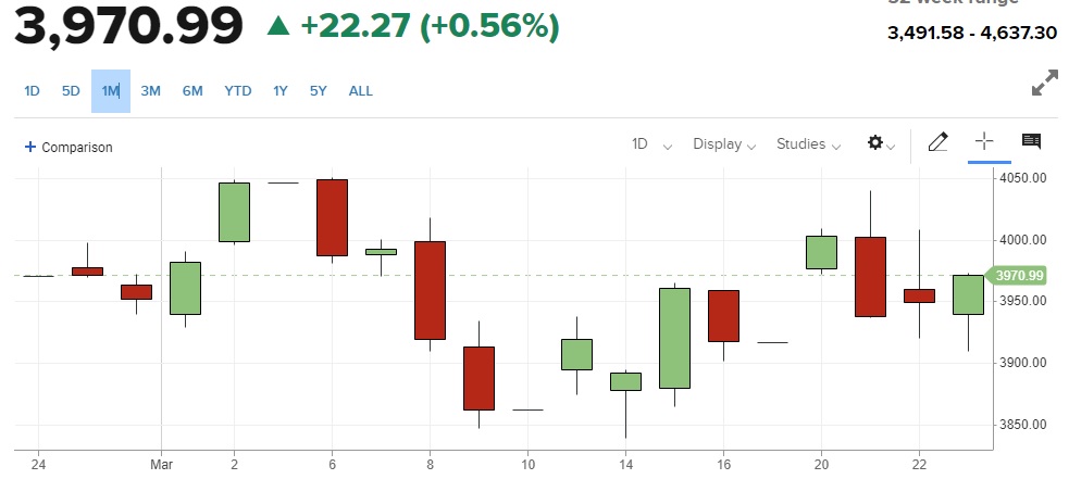 Up, down and all around. Not just across weeks and months…but INSIDE of a single session. This candlestick chart of the past month tells that story in spades: