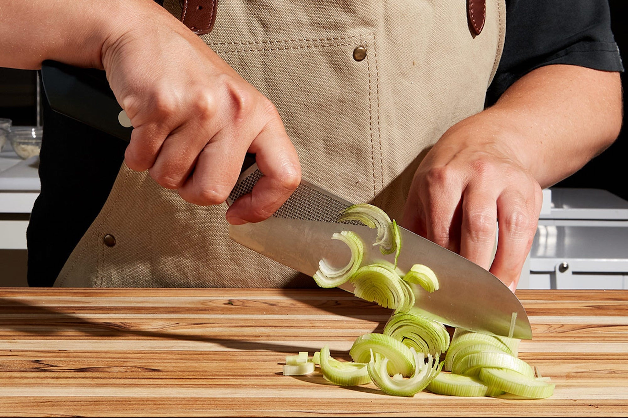 The Santoku knife is all about comfort, and this knife is no exception. The “lock-in” ergonomic handle is fashioned from durable matte-finished polymer. It’s broad at the top and narrower at the bottom for a palm-filling grip that prevents twisting, turning, or slipping while you’re using it. Plus, the scalloped blade heel makes the knife comfortable to choke up on while you’re chopping for a more confident grip. With plenty of blade steel to protect your fingers, you’ll be able to make quick work of all kinds of food.