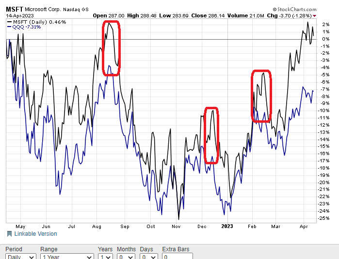 Look for Microsoft to revert and be a big underperformer over the coming weeks like it has done in the past.