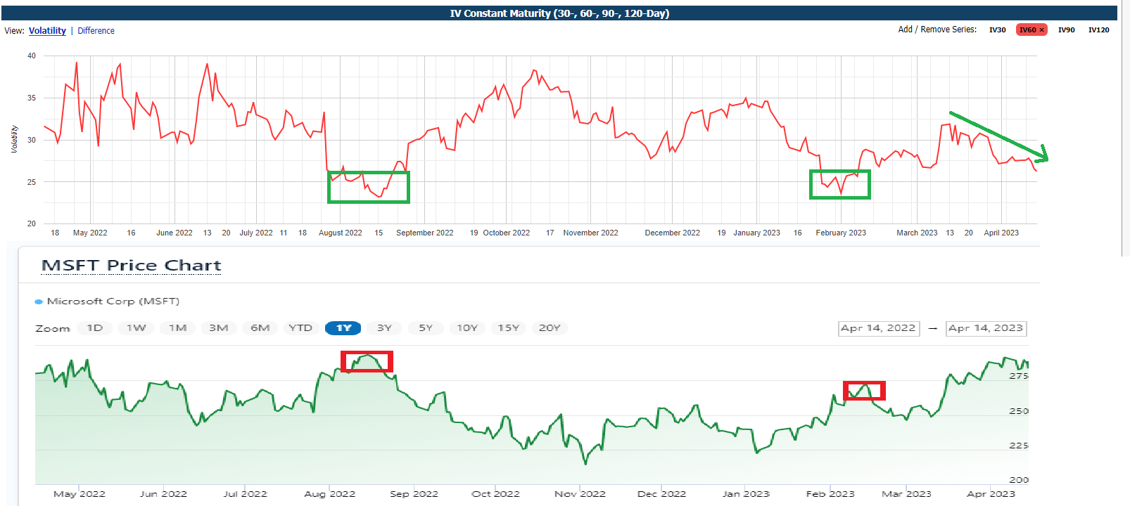 Notice how the lows in IV align nearly precisely with the recent tops in the price of Microsoft stock. Implied volatility can be a valuable market timing tool.