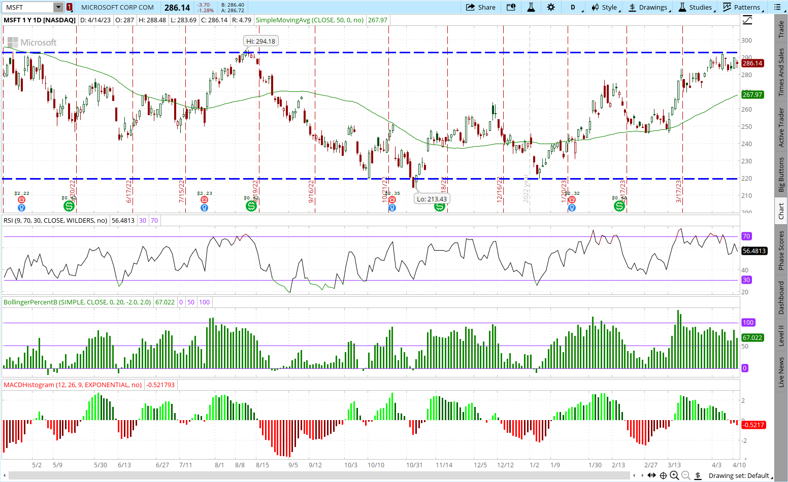 MSFT stock is also looking a little overdone on a comparative basis. Microsoft is now showing a slight gain in the past 12 months while the NASDAQ 100 (QQQ) is still down over 7% in that time frame. Normally MSFT and QQQ tend to move more in tandem, which makes sense given that Microsoft is the largest weighting in the NASDAQ 100 ETF at 12.68%.