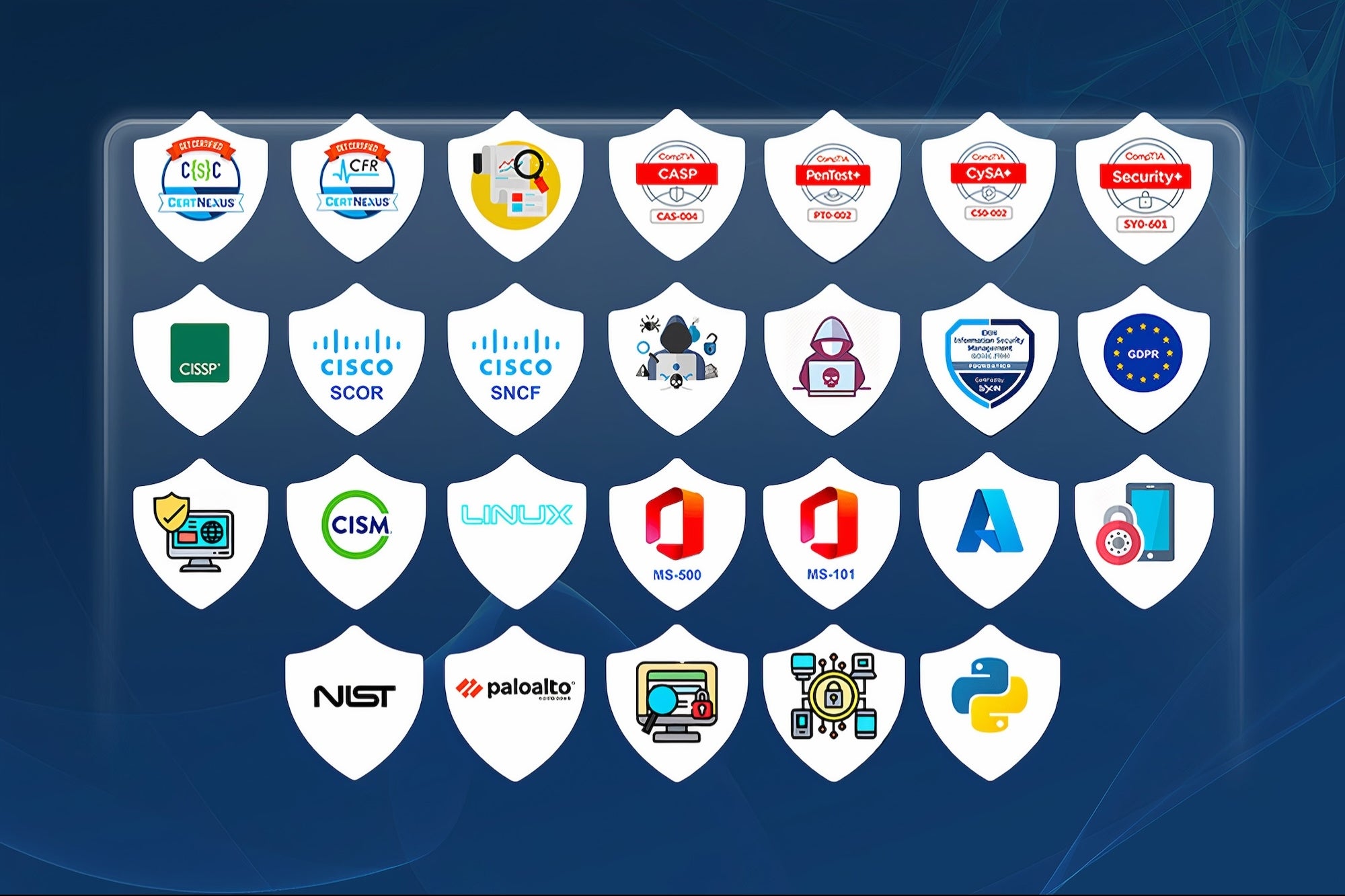 Courses include guides for coding in Python, tips for using operating systems like Linux for security, and lessons on using other IT tools and systems like Microsoft Azure. Learners can practice more hands-on ethical hacking skills like penetration testing or learn more about mobile security using Microsoft 365.