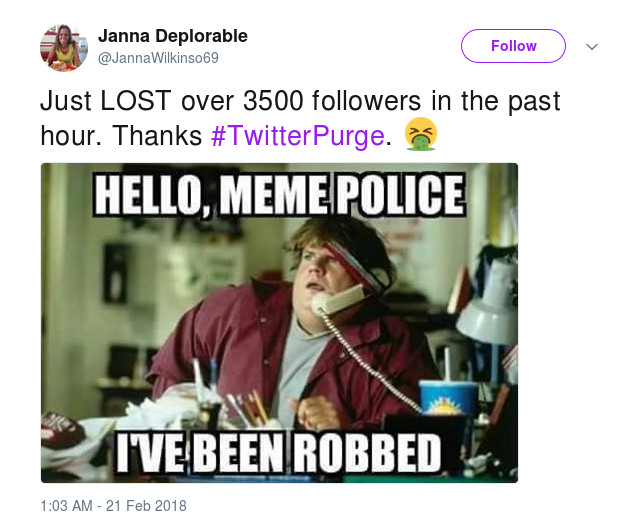 In response to the sudden culling of accounts, starting at around 1am Eastern Time today, some aligned with “alt-right” figures such as white supremacist Richard Spencer started the #TwitterLockOut and #TwitterPurge hashtags, and some resurfaced Project Veritas’ accusations that Twitter employees were deliberately censoring “right-leaning” accounts. Spencer himself claimed to have lost over 1,000 followers over a few hours overnight; Janna “Deplorable” Wilkinson, who had her own account suspended in October, claimed to have lost 3,500 followers.