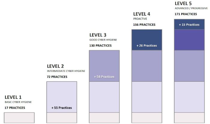 Volendo avere diversi livelli di requisiti di sicurezza in base alle informazioni da trattare, il Cybersecurity Maturity Model Certification è disegnato a livelli crescenti di misure di sicurezza, appunto dal Level 1 al Level 5; ogni livello si appoggia e migliora quello sottostante.