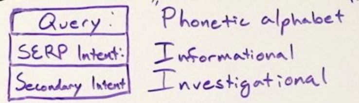 First, what is the primary SERP intent? For my example, I have phonetic alphabet, informational. Secondary intent might be investigational for the types of content people are looking for.