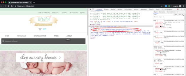 One of the infected sites identified by Netlab 360 is ilybean[.]com, an Orlando, Florida, business that sells baby beanies. As the screenshot below shows, the site executes JavaScript hosted at magento-analytics[.]com.