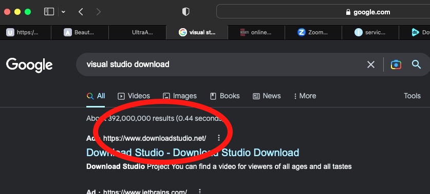 Anecdotal evidence that Google malvertising is out of control isn’t hard to come by. Searches seeking software downloads are probably the most likely to turn up malvertising. Take, for instance, the results Google returned for a search Thursday looking for “visual studio download”: