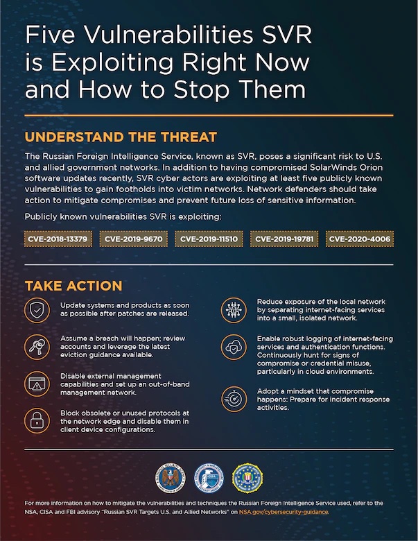 “Mitigation against these vulnerabilities is critically important as US and allied networks are constantly scanned, targeted, and exploited by Russian state-sponsored cyber actors,” the advisory stated. It went on to say that the “NSA, CISA, and FBI strongly encourage all cybersecurity stakeholders to check their networks for indicators of compromise related to all five vulnerabilities and the techniques detailed in the advisory and to urgently implement associated mitigations.”