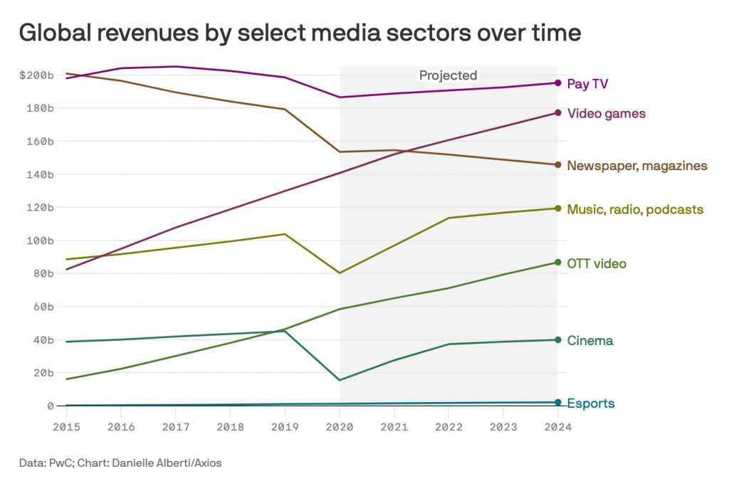 Se la voglia di evasione è a pieno titolo ciò che comprensibilmente ha caratterizzato l’anno e mezzo di pandemia mondiale, non stupisce che a una costante diminuzione del fatturato delle news e dei giornali – con le loro cattive notizie e gli aggiornamenti sul numero dei contagi e dei morti da coronavirus – abbia risposto un aumento sensibile del business della tv streaming, della musica, dei podcast e dei video OTT, segno di un utilizzo sempre più costante della rete, sia con connessioni Internet casa che Internet mobile (e in entrambi i casi, i comparatori come SOSTariffe.it possono aiutare a scegliere le offerte più convenienti disponibili sul mercato). Ma il dato che è forse più sorprendente riguarda un altro media (o più propriamente, un multimedia): il gaming, a cui tiene testa, al momento, soltanto lo streaming video.