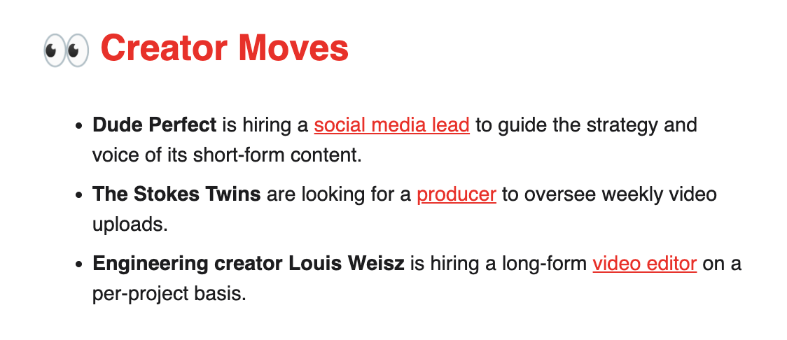 - Full-time creators with large audiences started hiring to expand their offerings, as evidenced by the constant stream of opportunities in newsletters like The Publish Press.