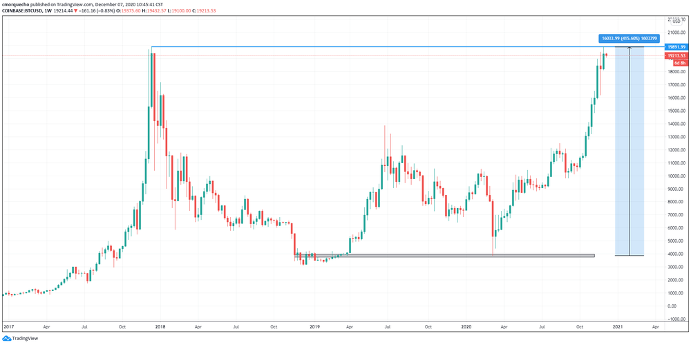 - The Bitcoin price graph shows the fall to key support, generated in November 2018 and exceeded in April 2019. Reaching a maximum of $ 9,214.67 usd and a minimum of $ 3,858 usd and closing the month at $ 6,424.35 usd . In November 2020, the price of Bitcoin not only reached, but exceeded the highest price of all time ( ATH – “ all time high ”), reaching $ 19,915.14 usd on Coinbase, a crypto-asset exchange platform; representing a growth of 415.60% compared to the lowest price of $ 3,858 usd in March.