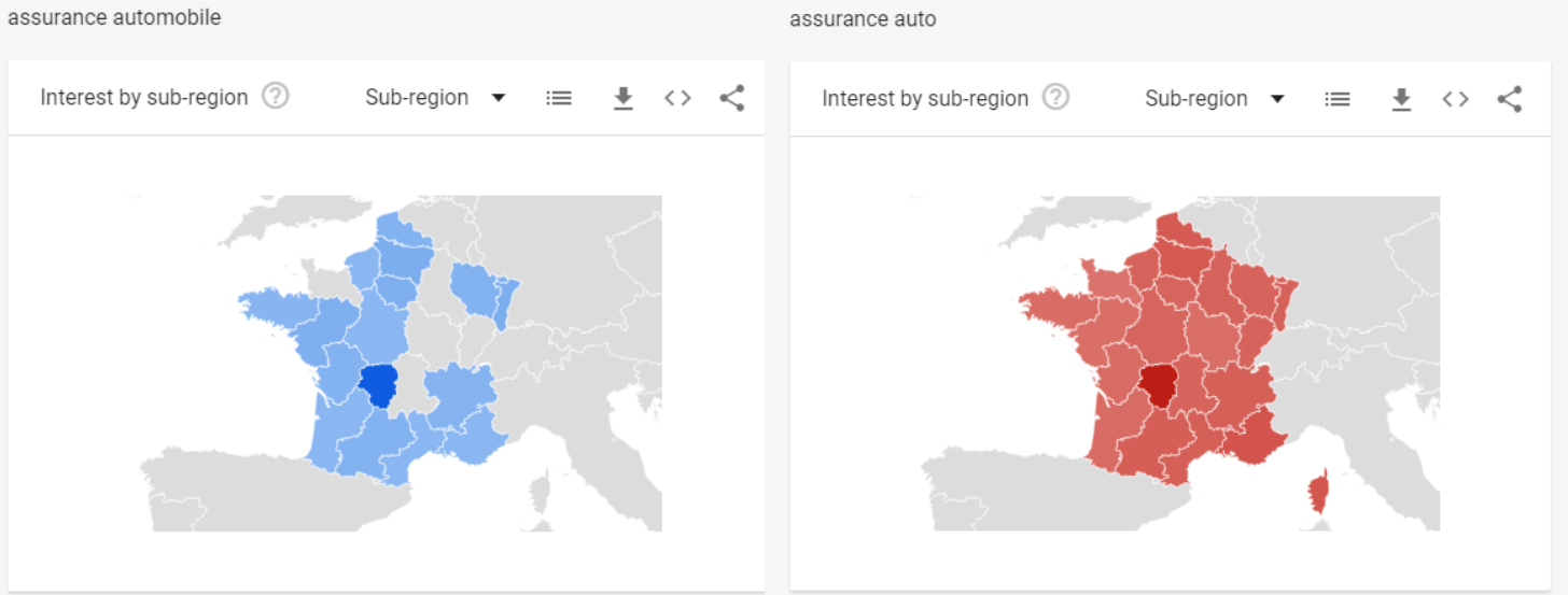 French consumers search for assurance voiture, assurance automobile and assurance auto. Assurance automobile is considered by Google a close variant of “assurance auto.” By comparing regional search volumes in France you can see that “assurance auto” is the stronger keyword with a wider geographic strength.