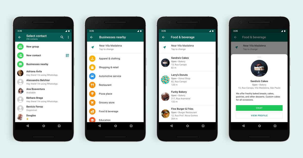 WhatsApp is piloting a new business directory in São Paulo, Brazil that lets users find local shops and services with a presence on the app, the service’s head Will Cathcart has announced. Screenshots show how WhatsApp will show businesses sorted by categories like “grocery store” and “restaurant,” before letting users chat directly with them. Reuters reports that the test will include thousands of businesses in the city.