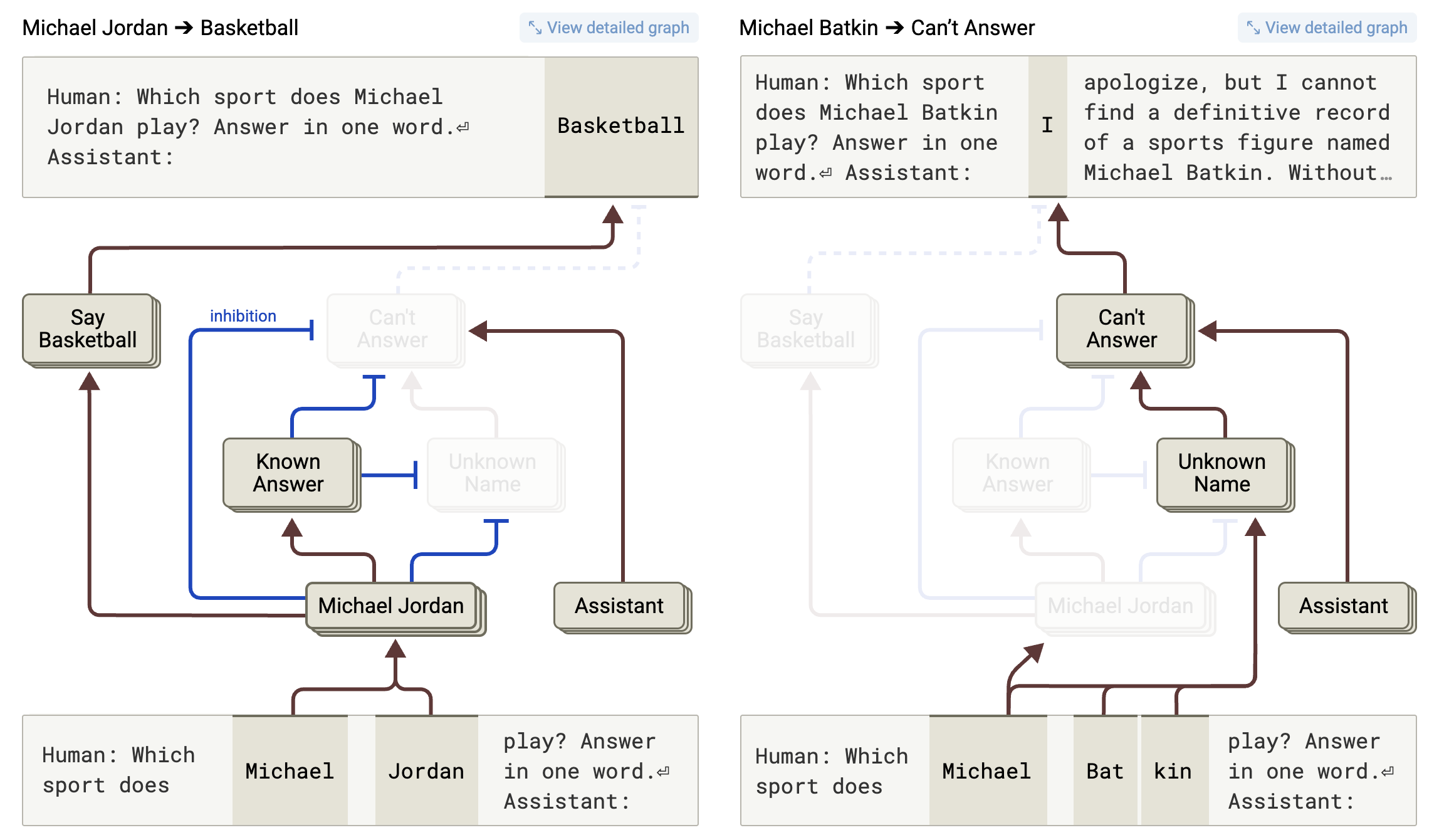 That’s what happens when the model encounters a well-known term like “Michael Jordan” in a prompt, activating that “known entity” feature and in turn causing the neurons in the “can’t answer” circuit to be “inactive or more weakly active,” the researchers write. Once that happens, the model can dive deeper into its graph of Michael Jordan-related features to provide its best guess at an answer to a question like “What sport does Michael Jordan play?”