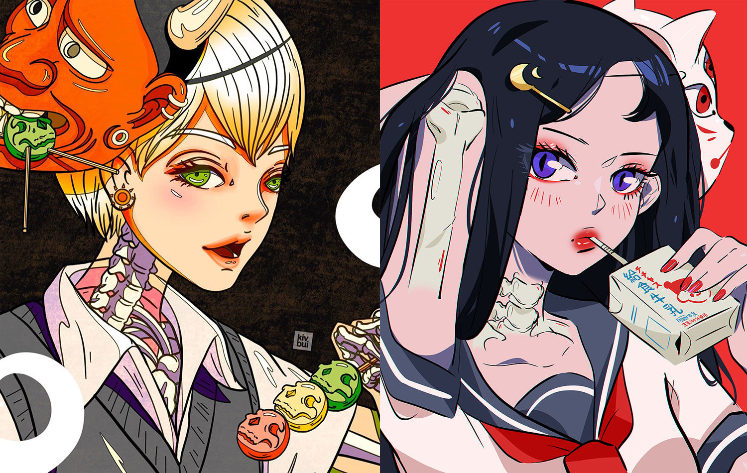 We bring to the chat the senses that are interesting and start expanding on it. We keep the prompt simple; for example, this one with my artist friend, , we decided each of us would draw an original character of mine, Moon Child and Sun Child, holding Japanese desserts and wearing a Yokai mask.