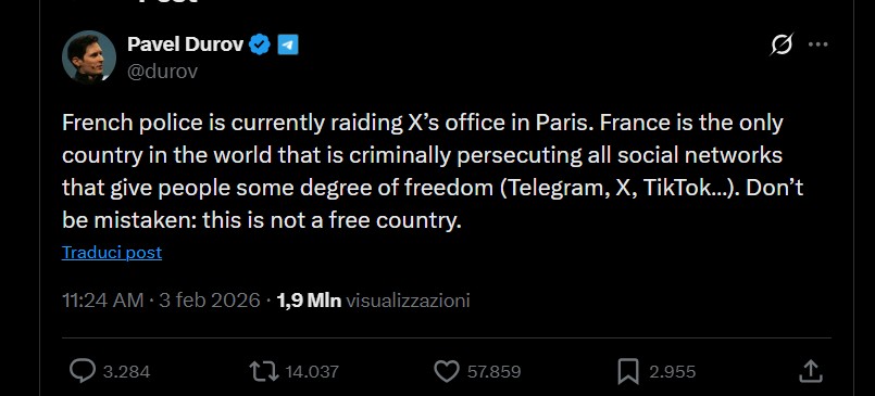 L’occasione ha permesso a Durov di intervenire, accusando la Francia di non essere “un paese libero”, mostrano quanto il tema sia diventato ideologico: “è l’unica nazione che perseguita penalmente tutti i social network che danno alle persone un certo grado di libertà”.